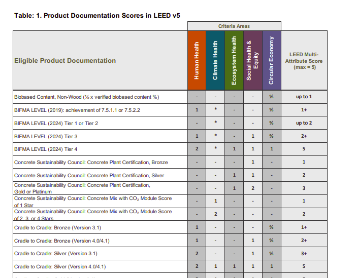 The new LEED v5 credit introduces a multi-attribute framework evaluating building products across five sustainability criteria areas: human health, climate health, ecosystem health, social health & equity, and circular economy.