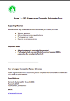 a structured process to raise concerns or submit formal complaints related to the governance, conduct, policies and procedures of the Concrete Sustainability Council (CSC) as an organization;